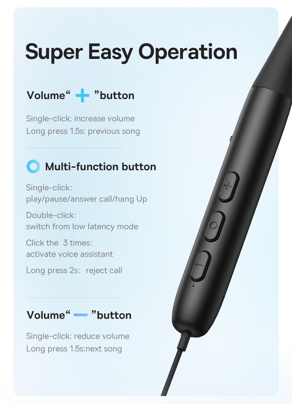 Lưu ý- Điều khiển trực tiếp trên tai nghe không cần dùng điện thoại :Cụ thể : Nút "+" âm lượng Nhấp một lần: tăng âm lượng; Nhấn và giữ 1,5 giây: bài hát tiếp theo.Nút đa chức năng: Một cú nhấp : phát / tạm dừng / trả lời Cuộc gọi / gác máy; Nhấn đúp : chuyển từ chế độ độ trễ thấp Nhấp vào 3 lần: kích hoạt trợ lý giọng nói; Nhấn và giữ 2 giây: từ chối cuộc gọi.Nút " -" nhấp 1 lần: Gaimr âm lượng; Nhấn giữ 1.5s trở về bài hát trước.