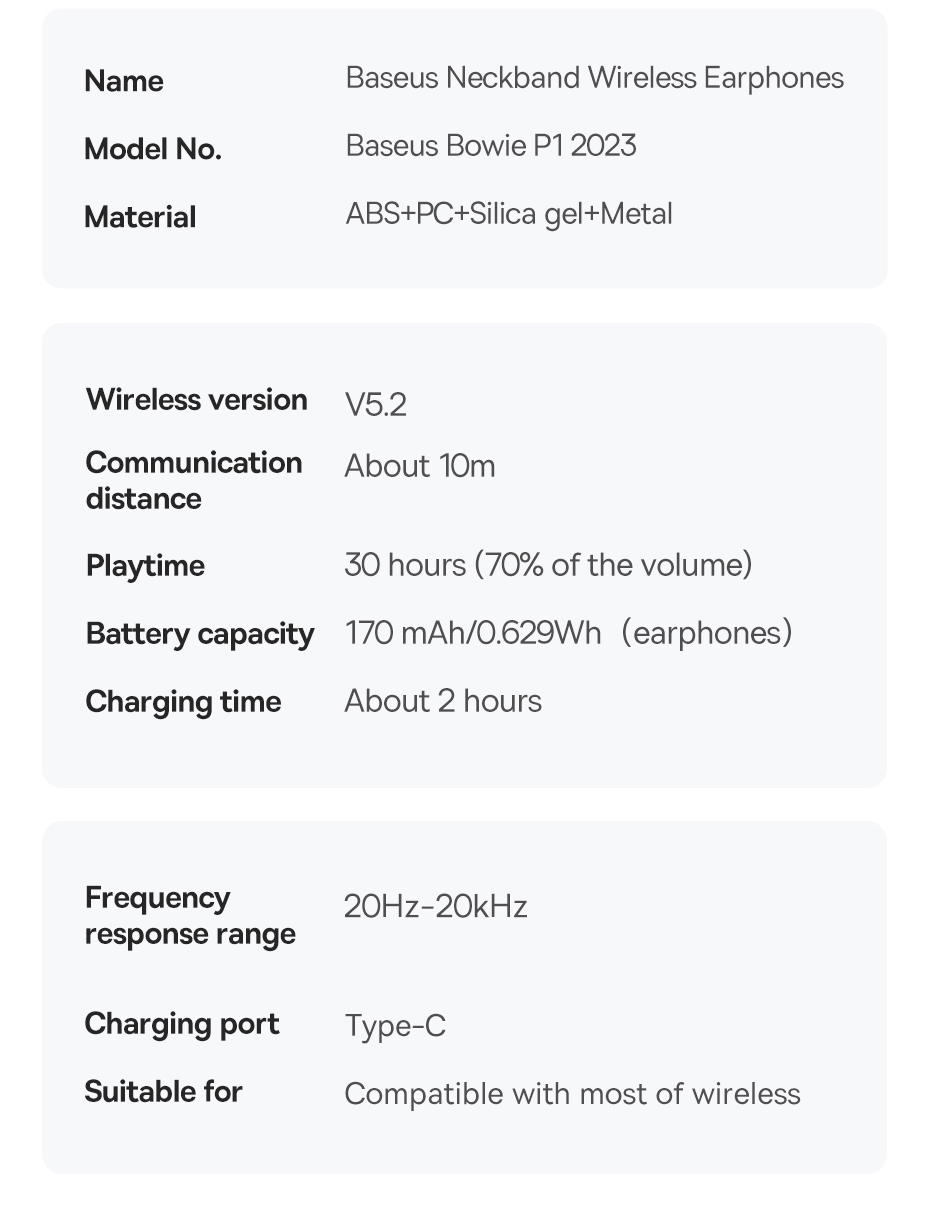 Thông số kỹ thuậtTên                  Tai nghe không dây đeo cổ nửa trong tai Baseus Bowie P1Vật chất             ABS + PC + silica gel + kim loạiPhiên bản          V5.2Khoảng cách     Khoảng 10mG...